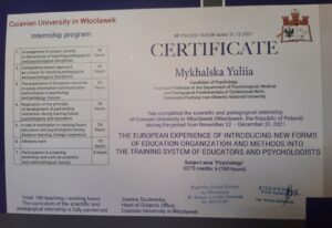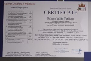 З 22 листопада по 31 грудня 2021 року кандидат психологічних наук, старший викладач кафедри психолого-медико-педагогічних основ корекційної роботи Михальська Ю.А. та кандидат педагогічних наук, доцент кафедри психолого-медико-педагогічних основ корекційної роботи Бугера Ю.Ю. проходили науково-педагогічне стажування в Куявському університеті у Вроцлавеку (Республіка Польща) на тему «Досвід європейських країн щодо впровадження в систему підготовки педагогів і психологів нових форм організації та методів освіти» в обсязі 6 кредитів (180 годин).